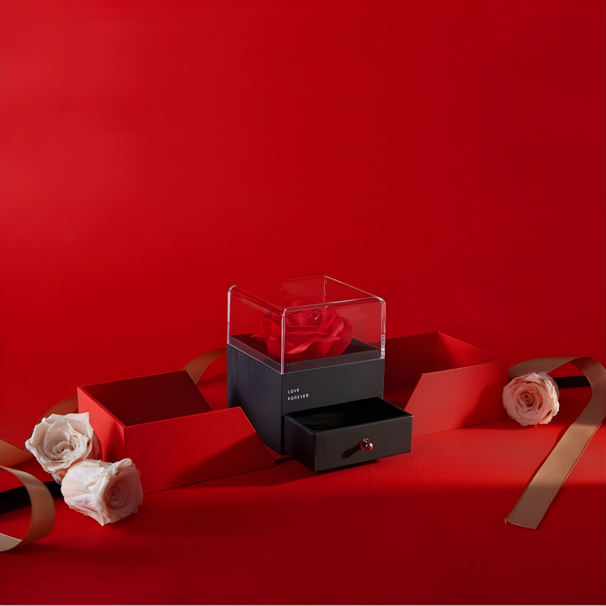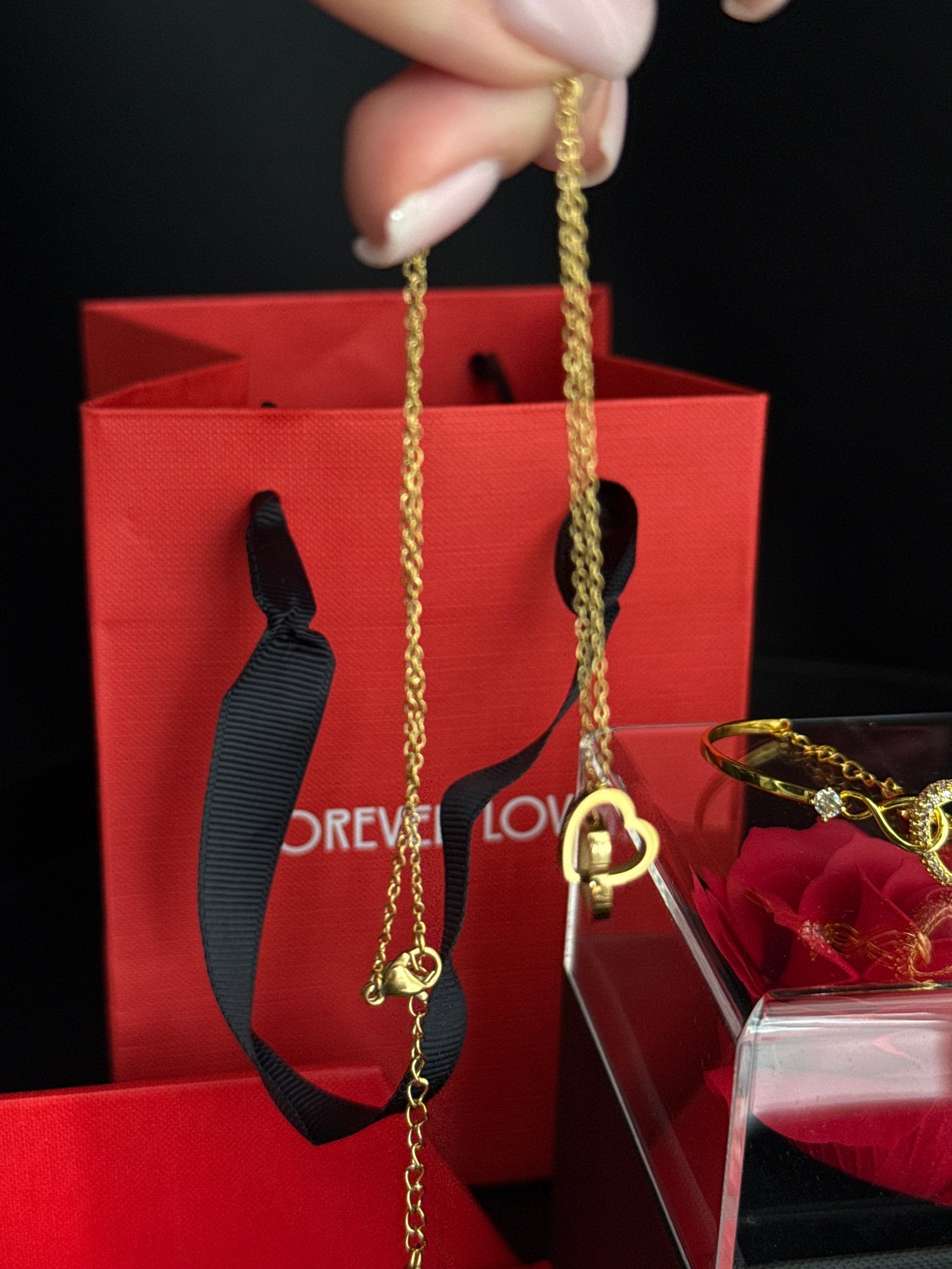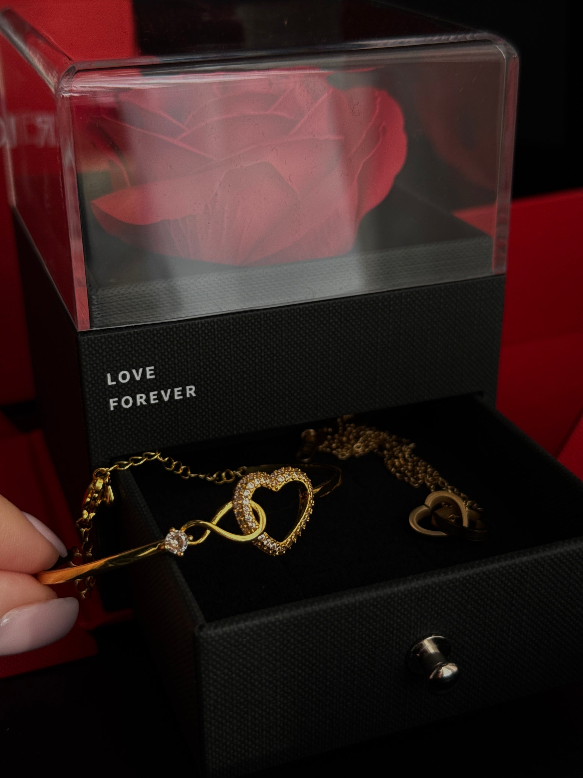 Komplet biżuterii w pudełku prezentowym – mydlana róża, złoty naszyjnik, złota bransoletka